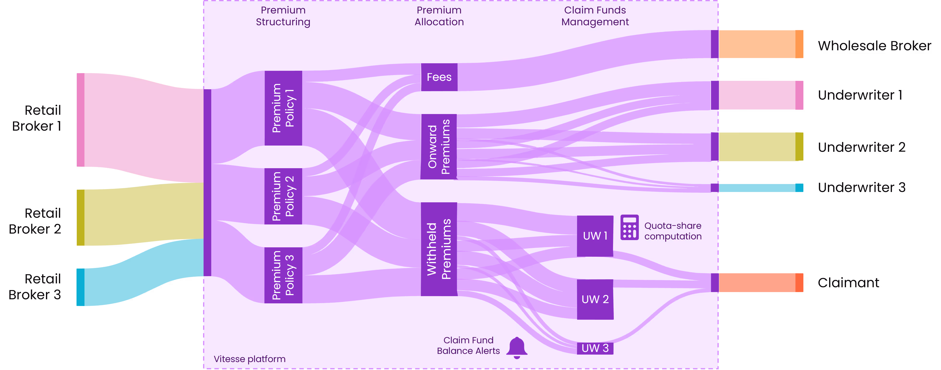 Vitesse helps wholesale brokers manage premium flows from retail brokers through to carriers, MGAs, and reinsurers with real-time visibility, controlled allocation, and full auditability.